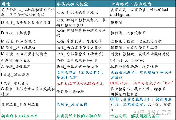 是不是并不复杂? 3. 常用工具简介六西格有简单的工具,容易学习和掌握。也有一些较为复杂的工具,在未能熟练掌握或者误用不合适的工具,大概率会导致轰轰烈烈开端,冷冷清清收场。 这里以郭大侠的品性、武功与六西格玛各类常用工具做一个类比,
