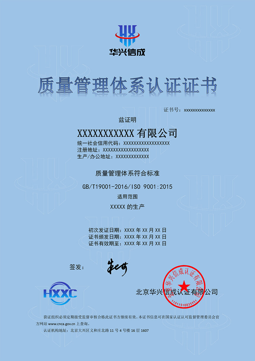 北京华兴信成认证有限公司安徽分公司具有国家认证认可监督监督颁发的认证机构批准证书(批准号:CNC-R-2022-990),主要为客户提供质量管理体系认证、环境管理体系认证、职业健康安全管理体系认证等管理体系认证。 ISO9001质量管理体系认证 ISO9001用于证实组织具有提供满足顾客要求和适用法规要求的产品的能力,目的在于增进顾客满意度。随着商品经济的不断扩大和日益国际化,为提高产品的信誉、减少重复检验、削弱和消除贸易技术壁垒、维护生产者、经销者、用户和消费者各方权益,这个第三认证方不受产销双方经济利益支配,公证、科学,是各国对产品和企业进行质量评价和监督的通行证;作为顾客对供方质量体系审核的依据;企业有满足其订购产品技术要求的能力。 凡是通过认证的企业,在各项管理系统整合上已达到了国际标准,表明企业能持续稳定地向顾客提供预期和满意的合格产品。站在消费者的角度,公司以顾客为中心,能满足顾客需求,达到顾客满意,不诱导消费者。 实行ISO 9001国际标准化的品质管理,可以稳定地提高产品品质,使企业在产品品质竞争中永远立于不败之地。 1、强化品质管理,提高企业效益。 2、增强客户信心,扩大市场份额,在产品品质竞争中永远立于不败之地。 3、提高全员质量意识,改善企业文化。 4、第三方认证,提供最广泛的认可,节省了第二方审核的精力和费用。 5、有效地避免产品责任。 6、获得了国际贸易"通行证",消除了国际贸易壁垒。 7、法律责任减免:如更容易的许可,更少的检查以及简化的报告要求等。 8、公众形象及社会关系,为消费者选择提供信心。