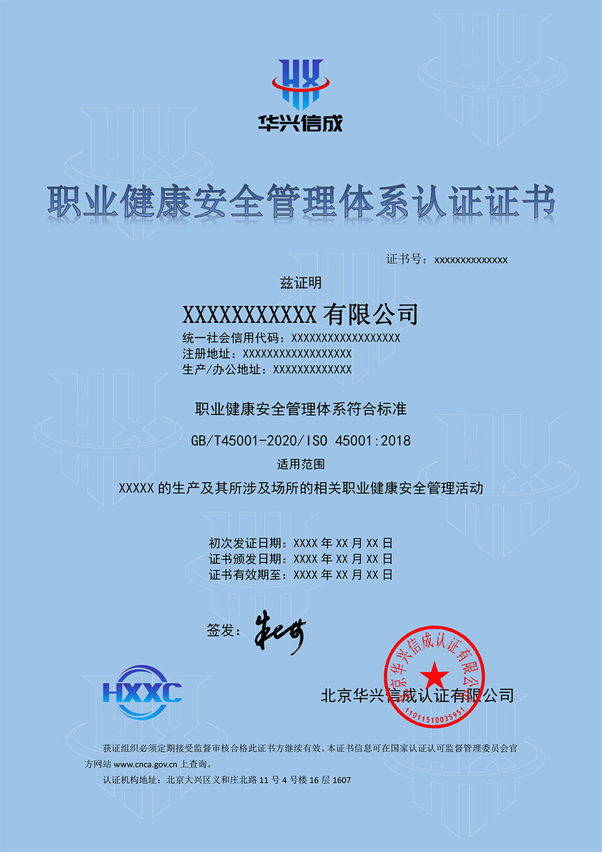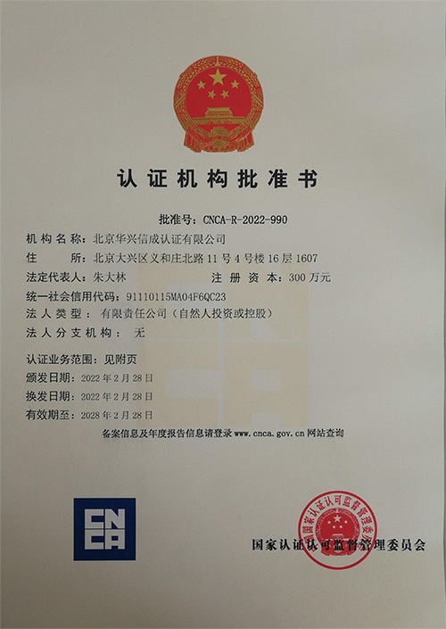 北京华兴信成认证有限公司安徽分公司具有国家认证认可监督监督颁发的认证机构批准证书(批准号:CNC-R-2022-990),主要为客户提供质量管理体系认证、环境管理体系认证、职业健康安全管理体系认证等管理体系认证。