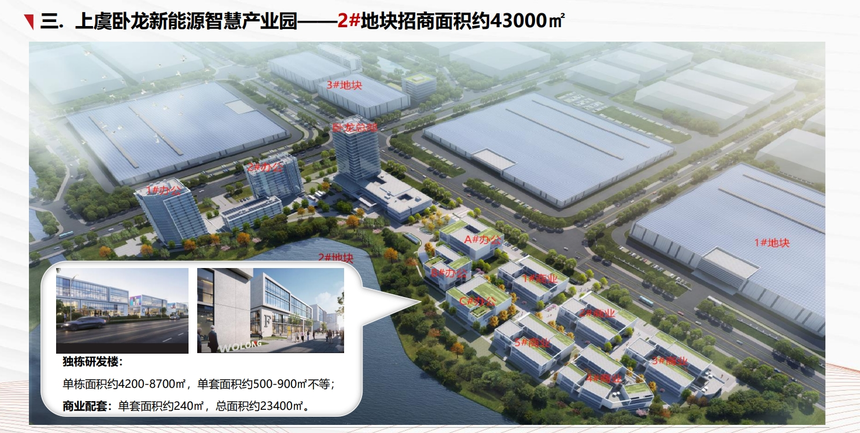 独栋研发楼: 单栋面积约4200-8700㎡,单套面积约500-900㎡不等; 商业配套:单套面积约240㎡,总面积约23400㎡。